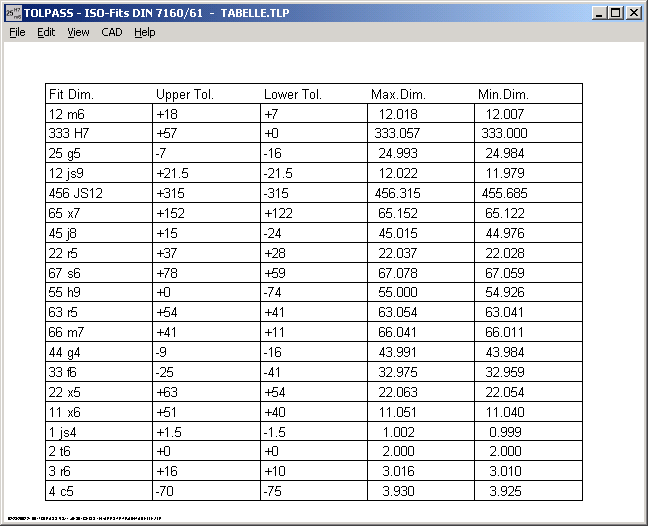 Table with ISO Tolerances and Max./Min. values may be exported to CAD as DXF or IGES file.