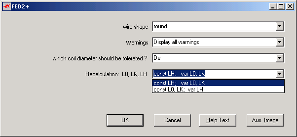 LK=L0-LH1-LH2 and L0=LK+LH1+LH2 are calculated after changing body length or spring length. Loop height was constant. Now you can configure FED2+ to recalculate loop length when changing L0, LK, n or loop position phi.