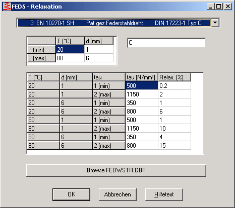 Die Erweiterung der Relaxations-Datenbank wurde vereinfacht. Für einen neuen Werkstoff müssen Sie die Relaxation für 2 Temperaturen, 2 Drahtdurchmesser und je 2 Schubspannungen eingeben (insgesamt 8 Werte). Das Federprogramm berechnet nur Zwischenwerte, deshalb sollten die Grenzwerte einen möglichst großen Bereich umfassen (z.B. T1=20°C, T2=200°C, d1=0.5mm, d2=10mm).