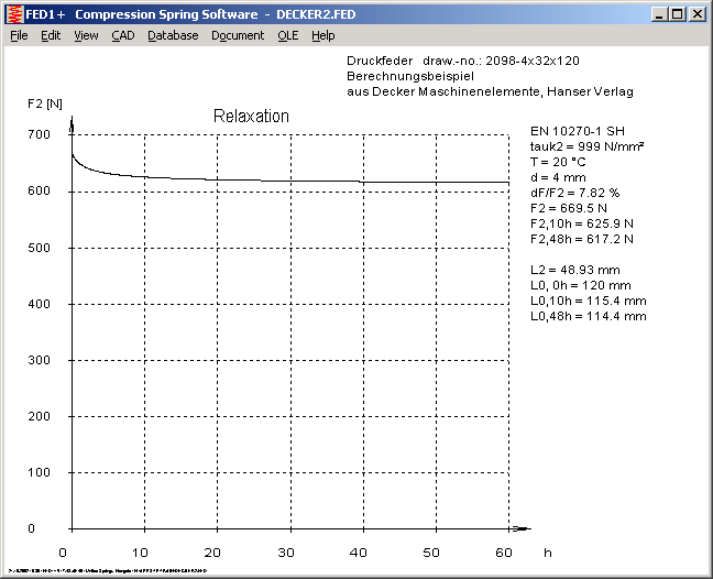 In den Federprogrammen FED1+ und FED2+ wird der Federkraftverlust bei Belastung durch die Federkraft F2 nach 10 Stunden und 48 Stunden berechnet. Daraus kann man auch die Federlänge nach Relaxation berechnen. Da Federlänge L2 und Federrate R unverändert bleiben, ist die neue Federlänge: