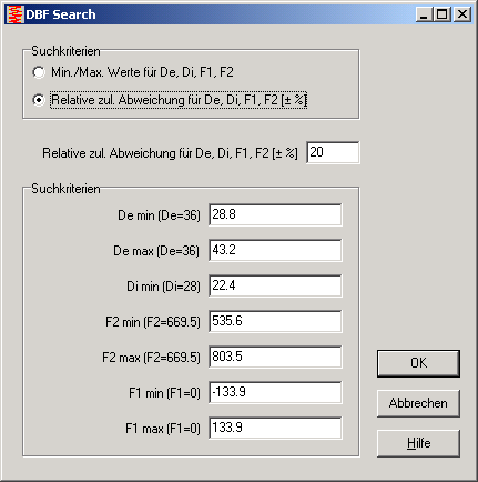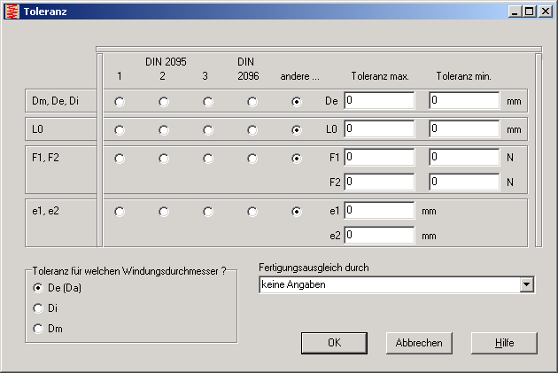 Bei der Suche nach einer geeigneten Normfeder aus der Federdatenbank gab es keine Ergebnisse, wenn die Federkraft F1 = 0 war. In diesem Fall ist L1=L0, gefunden wurden aber nur Federn mit L0 > L1 bei Druckfedern und L0 < L1 bei Zugfedern. Bei Eingabe einer relativen Abweichung in % wird die Toleranz der Federkraft F1 nun generell aus F2 berechnet, weil bei F1=0 die Toleranz=0 wäre.