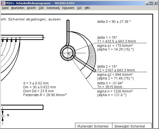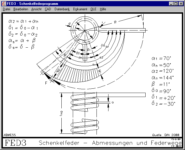 Das Hilfebild zu den Abmessungen und Federwegen der Schenkelfeder wurde farblich verbessert, außerdem wurden die wichtigsten Formeln ergänzt und die Federwinkel der abgebildeten Drehfeder. Im Vergleich zur Druckfeder entspricht der Federwinkel alpha dem Federweg s, und die Federlänge L dem Schenkelwinkel delta. Der unbelastete Federwinkel delta0 entspricht der unbelasteten Federlänge L0 und kann einen beliebigen Wert annehmen. Alpha0 ist 0. Bei Belastung wird der Federwinkel alpha größer und der Schenkelwinkel delta um den gleichen Betrag kleiner. Bei langen Schenkeln muss die Durchbiegung der Schenkel mit dem Winkel ß berücksichtigt werden.