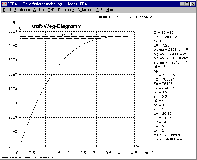 Der Federweg der dargestellte Feder mit h0/t = 4.23 / 3 = 1.41 liegt zwischen 3.5 und 4 mm. In diesem Bereich der Federkennlinie nimmt die Federkraft nur noch gering zu. Die Tellerfeder könnte man in diesem Bereich einsetzen als "Konstantkraftfeder" z.B. zum Ausgleich von Temperatureinflüssen bei Schraubenverbindungen.