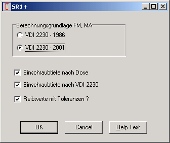 Bisher wurde im Ausdruck die Mindesteinschraubtiefe nach Dose und nach VDI 2230 ausgegeben. In der neuen Version kann man wählen, welche der beiden Berechnungsmethoden verwendet werden soll. In der Standardeinstellung werden beide Werte ausgegeben (wie bisher).
