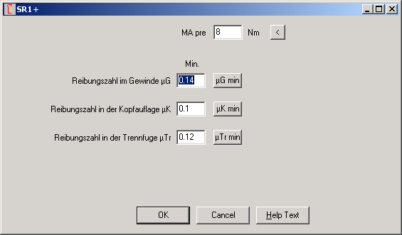 Seit Version 11.0 kann man in SR1 Maximalwerte für die Reibungskoeffizienten eingeben, SR1 berechnet dann aus alpha_a die zulässige Streuung sowie Einstellwert und Mindestdrehmoment des Anziehwerkzeugs. In der neuen Version 12.5 kann man die Eingabe der Reibungstoleranzen abschalten, die Eingabe "Reibung" sieht dann aus wie früher. Im Ergebnisausdruck wird dann nur das Anziehdrehmoment MA,max ausgegeben. Außerdem kann man unter "Anziehverfahren" nur alpha_A eingeben.