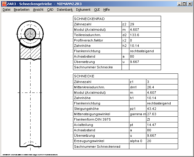 Die neue Quick-Ansicht von ZAR3 zeigt eine Zeichnung des Schneckengetriebes und Tabellen mit den Daten von Schnecke und Schneckenrad.