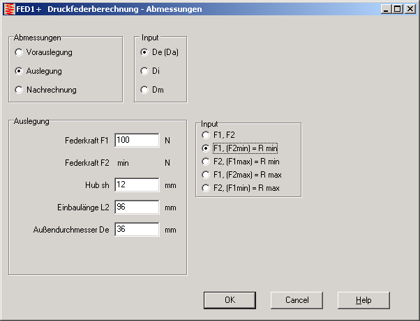 In der Basiseingabe Auslegung kann man entweder die Federkräfte F1 und F2, oder nur eine Federkraft eingeben, und die andere für die kleinst- oder größtmögliche Federrate berechnen lassen. Dies war bisher schon möglich in der Online-Auslegung (mit F1,F2 "<", ">"), hier wird jedoch zusätzlich noch der Drahtdurchmesser optimiert.