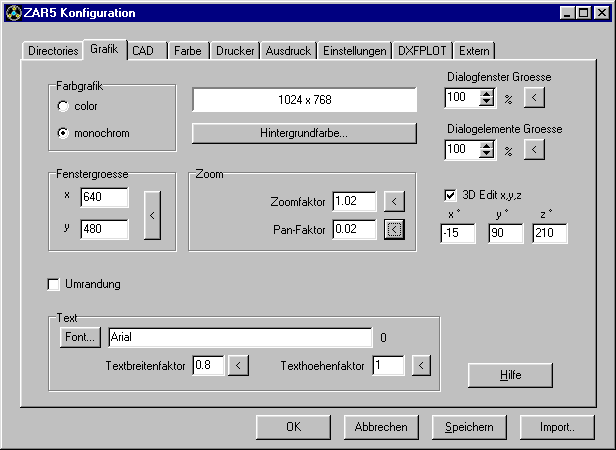 Wem die Texte in allen Anwendungen zu klein sind, sollte besser unter Windows bei der Konfiguration von Grafikkarte und Display "Große Schriften" wählen. Anschließend (nach Neustart von Windows) muss man im HEXAGON-Programm die Dialogfenstergröße ändern (Klick auf "<"-Button). Die Einstellung von "Dialogelement Größe" bleibt in dem Fall unverändert bei 100%.