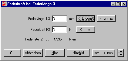 Nach Eingabe der Wendepunkte kann die Feder berechnet werden. Zuvor wird nach der Federlänge L0 gefragt. Wenn Federweg s1 oder Federrate des ersten Abschnitts vorgeschrieben sind, wird L0 daraus berechnet, andernfalls kann man den Vorschlagswert L0min übernehmen. Die Blocklänge Lc wird begrenzt durch durch die Mindestlänge Lcmin = nt*d und durch Lcmax = Federlänge der letzten Position der eingegebenen Federkennlinie. Wählt man Lc größer als Lcmin, dann wird der Platz durch inaktive Endwindungen ausgefüllt.