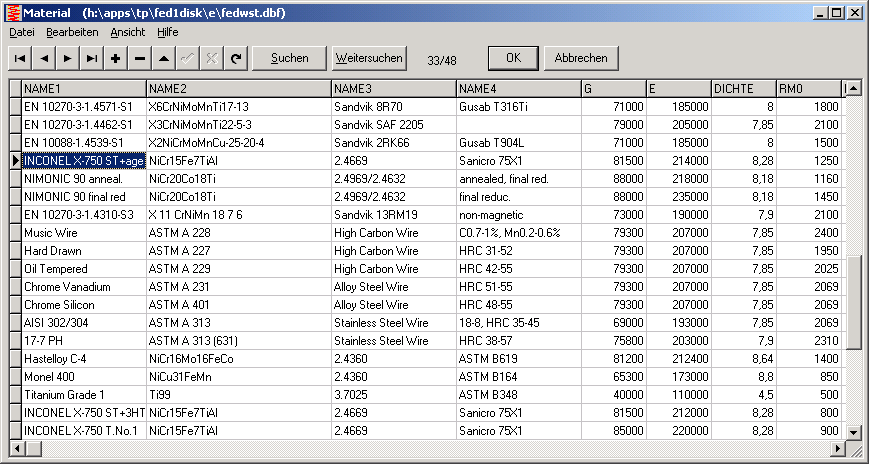 Database for spring materials was extended with Hastelloy C-4, Monel 400, Titanium, and Inconel X750 for different heat treatment. Unfortunately, Goodman diagrams and relaxation data are not yet available for the new materials. Tensile strength for all this materials is independent from the wire diameter.