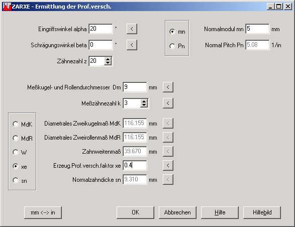 In einem komfortablen Eingabefenster für alle Abmessungen wählt man das gewünschte vorgegebene Prüfmaß oder xe, die anderen Prüfmaße und der Profilverschiebungsfaktor werden sofort berechnet und angezeigt.