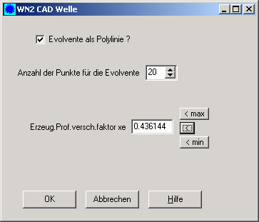 Die Übernahme der Profilzeichnung von Welle und Nabe wurde vereinfacht. "Zahnprofil Welle" und "Zahnprofil Nabe" wurde neu in das CAD-Menü aufgenommen. Vor Ausgabe der DXF- oder IGES-Datei kann man die CAD-Einstellungen anpassen, oder mittels Erzeugungs-Profilverschiebungsfaktor das Spiel bzw. Übermaß der Welle/Nabe-Passung verändern. Die Buttons "min" und "max" errechnen xe für oberes und unteres Abmass des zuvor eingegebenen Toleranzfeldes. Vorgabewert für xe ist Toleranzmitte.