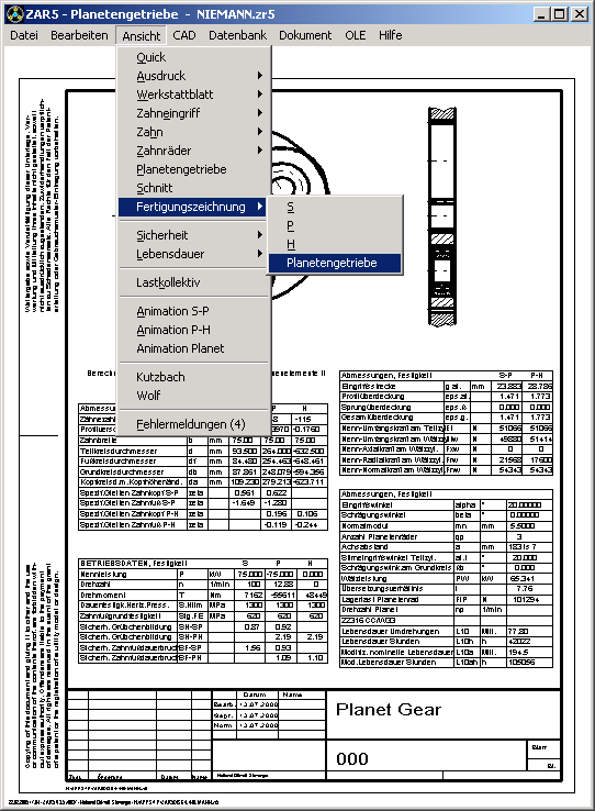 Das Ansicht-Menü wurde übersichtlicher strukturiert mit Untermenüs, so daß die gewünschte Darstellung schneller gefunden und angezeigt werden kann. Unter "Ansicht->Tabellen" wurden Tabellen mit Verzahnungsdaten, Prüfmaßen und Toleranzen neu aufgenommen.