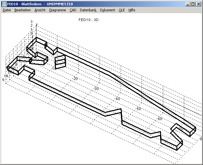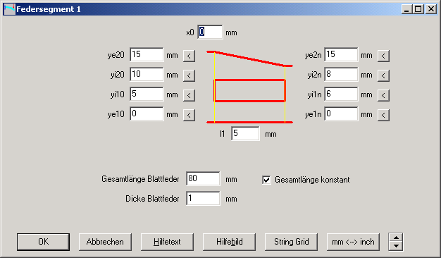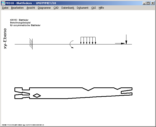 Bisher war die Eingabe in FED10 auf symmetrische Blattfedern beschränkt. Die Eingabe der Geometrie von symmetrischen Blattfedern ist einfach, man definiert die Breite und Länge des Federabschnitts. Mit der neuen Version 2.0 ist auch die Berechnung von Blattfedern mit asymmetrischer Geometrie möglich. Die Belastung wird zentrisch angenommen, Querbiegung und Verdrehung durch asymmetrische Belastungen können nicht berechnet werden. In der Eingabe werden für jeden Abschnitt Anfangs- und Endkoordinaten der Außenabmessungen und eventueller Aussparungen eingegeben. Bohrungen werden am einfachsten als Raute definiert. Für die interne Berechnung wird die Geometrie in eine symmetrische Blattfeder mit gleichen Eigenschaften umgewandelt.