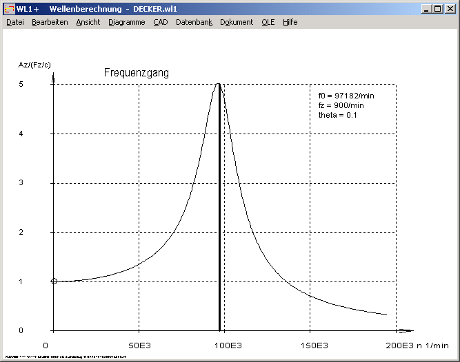 Die Übertragungsfunktion aus Eigenfrequenz der Welle, Zwangsfrequenz (Drehzahl) und Dämpfungskonstante wird nunmehr dimensionslos ausgegeben. Das spart die Eingabe von Amplitude (Durchbiegung) bzw. x-Position auf der Welle.