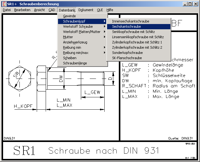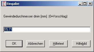 Bei Eingabe der Schraube kann man die Durchmesser d2 und d3 mittels Toleranzklasse vom Programm berechnen lassen, oder manuell eingeben. In dem Fall ist dann d2min=d2max=d2 und d3min=d3max=d3 und d_max=d. Der kleinste Gewindedurchmesser d_min wird für die Berechnung der Mindesteinschraubtiefe nach VDI 2230 verwendet, deshalb wurde die Eingabe um d_min erweitert. Bei der Übernahme der Berechnungsformeln nach Alexander von 1977 haben es die VDI-Fachleute dagegen nicht so genau genommen: die verwendeten Berechnungsformeln gelten nur, wenn der Schraubenwerkstoff besser ist als der Mutterwerkstoff. Für gleichwertigen Werkstoff und höherwertigen Mutterwerkstoff gibt es einen anderen Berechnungsansatz mit dem Faktor C2.