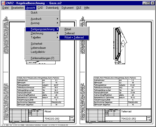 Menü "Ansicht" und "CAD" neu strukturiert mit Untermenüs. Fertigungszeichnungen von Ritzel und Tellerrad lassen sich jetzt zusammen auf einer Bildschirmseite darstellen.