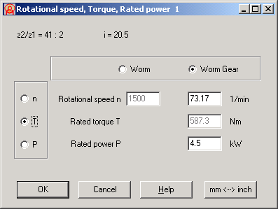 Unter "Bearbeiten->Leistung kann man jetzt Drehzahl, Drehmoment, Leistung für Schnecke oder Schneckenrad eingeben.