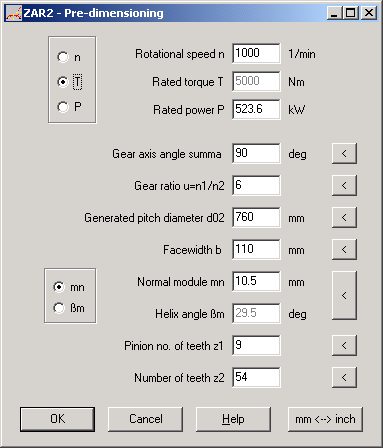 A new input windows makes pre-dimensioning of bevel gears with Klingelnberg geometry more comfortable. By means of the "<"-Button, ZAR2 calculates suggested values. Please pay attention to input values from top until bottom in this sequence, because the suggested values are computed from the input values above.