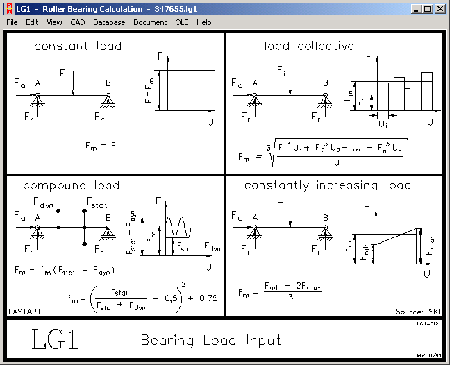 Equivalent bearing load is calculated from average axial load and average radial load on the bearing. Average radial and axial load can also be calculated from load spectrum, static/dynamic load or periodical load. Input window was neatly grouped in the new version, edit windows open when you select load type.