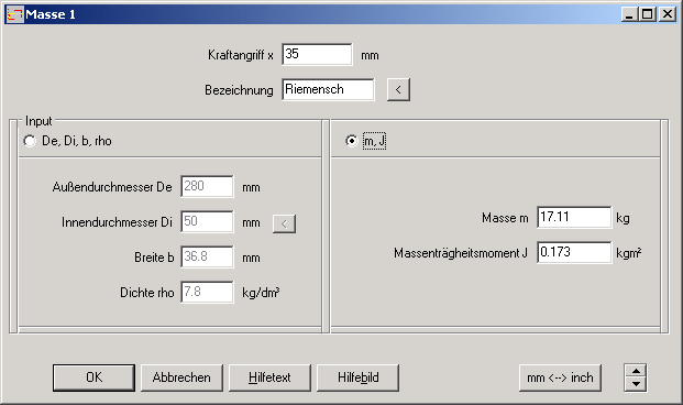 Externe Massen auf der Welle werden durch Eingabe von Masse m (für Berechnung biegekritischer Drehzahl) und Massenträgheitsmoment J (für Berechnung torsionskritischer Drehzahl) definiert. Alternativ kann man auch Abmessungen und Dichte eingeben. Im neuen Eingabefenster werden die Werte online umgerechnet.