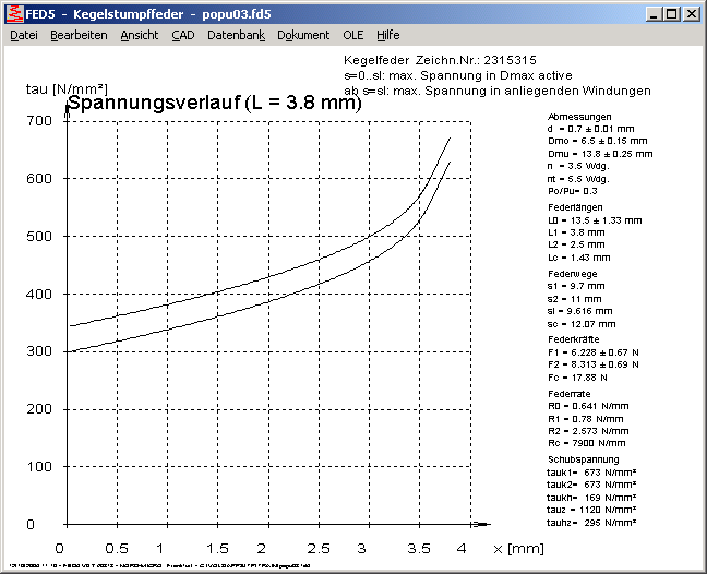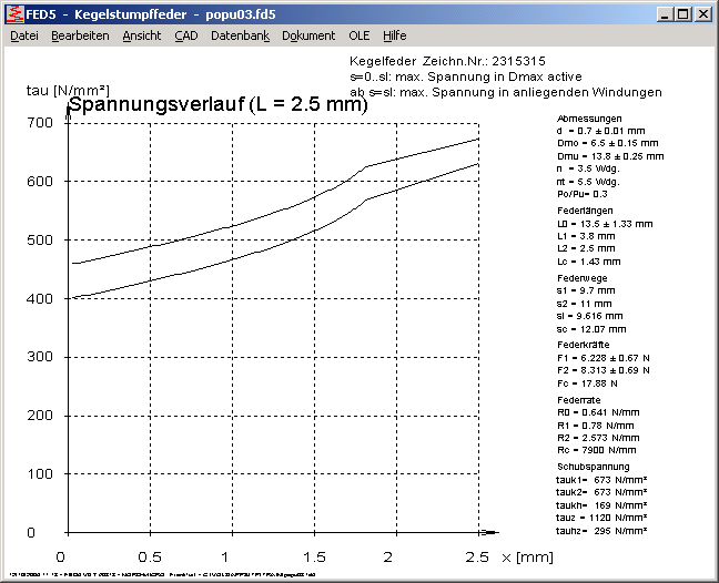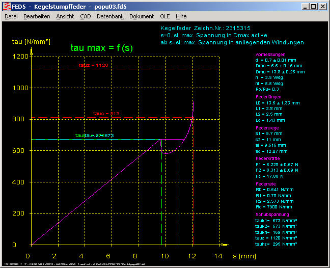 In FED5 wurde deshalb eine Änderung erforderlich, in diesem Fall wird jetzt als tau2 und tauk2 die (größere) Spannung in den angelegten Windungen ausgegeben. Wenn nun die Federwege s1 und s2 in diesem Bereich liegen, sind die Größtspannungen tau1 und tau2 identisch. Dies jedoch nur, weil die Größtspannung bei Federweg s1 und s2 an unterschiedlichen Stellen auftritt.
