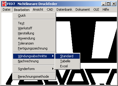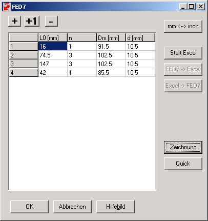 Bei der Eingabe der Abmessungen von nichtlinearen zylindrischen Druckfedern mit FED7 kann man für jeden Windungsabschnitt Windungszahl, Federlänge, Windungsdurchmesser und Drahtdurchmesser variieren. Für die Eingabe gibt es 3 Möglichkeiten: einzeln, in einer Tabelle, oder extern mit Microsoft Excel.