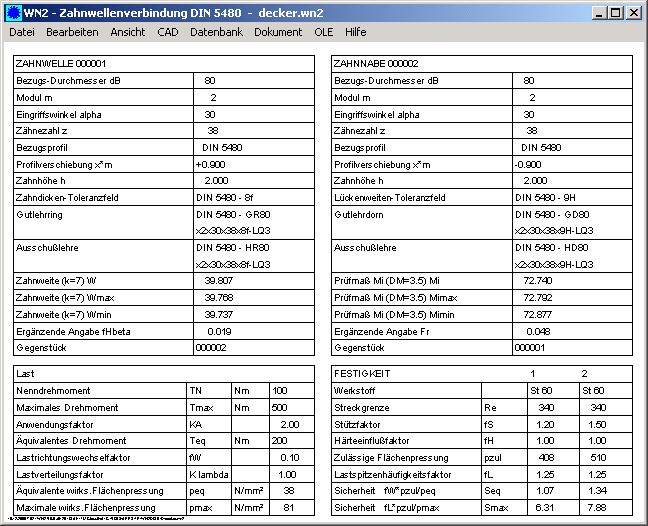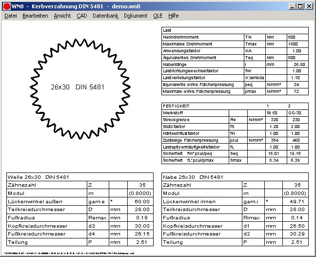 Das Zahnprofil von Welle und Nabe kann über DXF- oder IGES-Schnittstelle in CAD exportiert werden. Flächenpressung, übertragbares Drehmoment und Sicherheiten werden berechnet nach Niemann Maschinenelemente 1 (Ausgabe 2005).