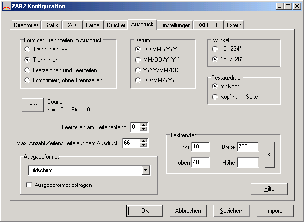 Unter Datei-Einstellungen kann man jetzt konfigurieren, ob Winkel im Ausdruck mit Nachkommastellungen oder in Winkelgrad mit Winkelminuten und Sekunden ausgegeben werden sollen. Bis jetzt betrifft dies nur die Programme ZAR2, ZAR3 und ZAR6. Wenn Sie die Anzeige von Winkelgraden mit Minuten und Sekunden in anderen Programmen vermissen, lassen Sie es uns bitte wissen.