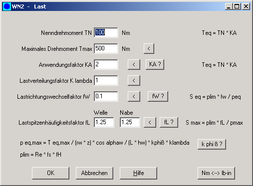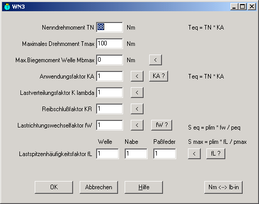 Der Faktor K lambda berücksichtigt die Lastverteilung bei Passfedern über die Nutlänge. Für den häufigsten Fall "Lastverteilung mitte" und "D/d > 1.7" (Nabendurchmesser/Wellendurchmesser) kann man mit dem "<" Button den Diagrammwert aus DIN 6892 berechnen lassen.