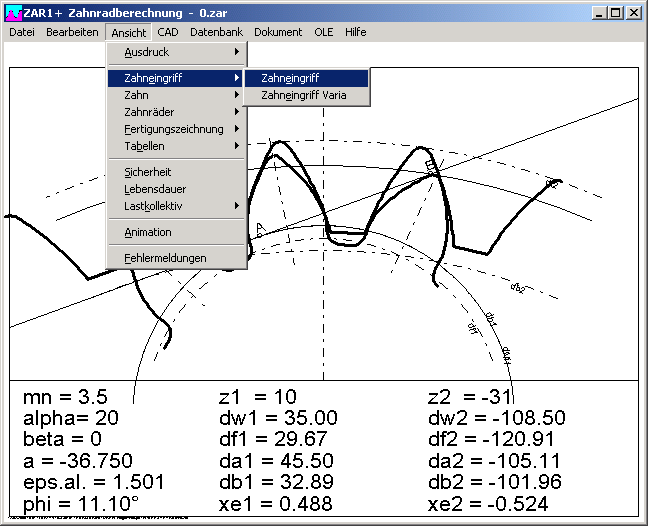 Unter Anzeigen-Zahneingriff gibt es jetzt ein Untermenü für Zahneingriff ohne oder mit Optionsfenster. Neu bei den Einstellmöglichkeiten ist ein Auf/Ab-Knopf zum Verstellen des Drehwinkels. Das Verzahnungsbild wird nach Änderung von Einstellungen sofort im Hintergrund aktualisiert (ohne OK oder Enter).