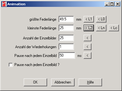 Bei der Animation der Feder kann man jetzt eine Pause in ms zwischen den Einzelbildern angeben. Außerdem wurden die Vorgabewerte an schnellere Rechner angepaßt, und für die Federlängen L0, L1, L2 und Lc (bzw. die entsprechenden Federwinkel) gibt es Buttons zur Datenübernahme.