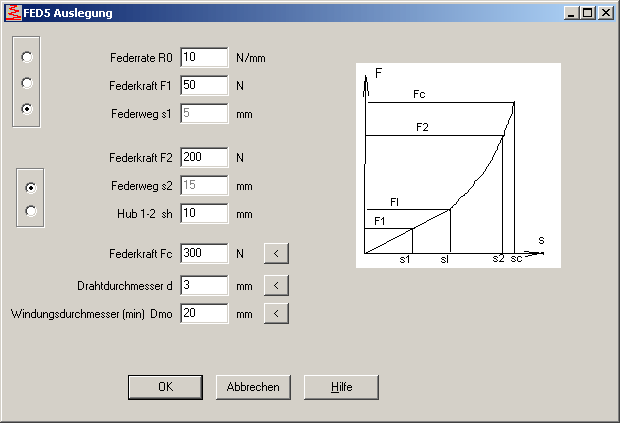 Eingabewerte sind Federkräfte F1, F2 und Federwege s1,s2, oder lineare Federrate R0, Federkräfte F1, F2 und Hub sh. Die Blockkraft Fc ist Eingabewert, dadurch kann man den Sicherheitsabstand von Federweg 2 bis Block bestimmen. Für den Drahtdurchmesser kann man einen Vorschlagswert berechnen lassen. Der kleinere Windungsdurchmesser Dmo am oberen Federende ist Eingabewert, der große Windungsdurchmesser Dmu am unteren Ende bestimmt den Grad der Progression und wird vom Programm berechnet. Die berechnete Kegelfeder hat konstante Steigung (Po/Pu=1).
