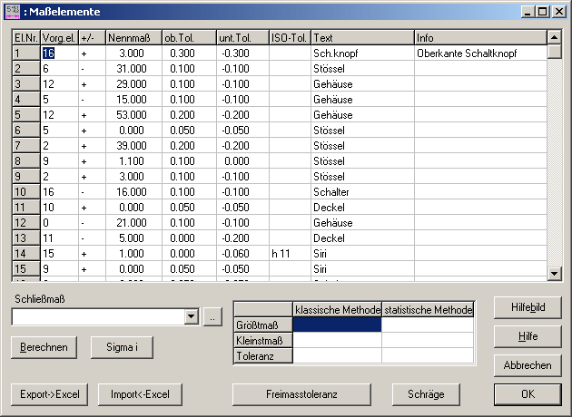 Für die Benennung der Maßelemente ist ein Textfeld mit bis zu 18 Zeichen vorgesehen. Wenn dieser Platz nicht reicht, kann man jetzt in einem zusätzlichen Infofeld die einzelnen Maßelemente beschreiben (max. 60 Zeichen). Im Ausdruck wird der Langtext nur ausgegeben, wenn die Felder tatsächlich beschrieben sind.