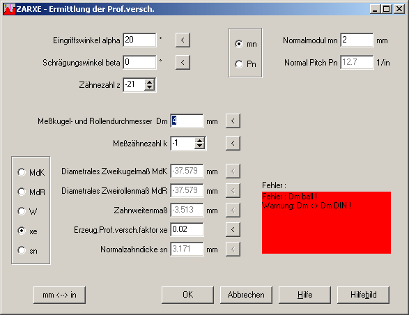 In den Zahnradprogrammen kann man für den Meßkugelmesser einen geeigneten Wert vorschlagen lassen. Oft muß der Vorschlagswert geändert werden auf das nächste Maß der im Betrieb vorhandenen Meßkugeln und Meßrollen. Wenn die Abweichung zu groß ist, werden falsche Werte berechnet. Für abnehmenden Kugeldurchmesser wird dann das Kugelmaß größer statt kleiner, bei Innenverzahnungen erhält man denselben Effekt bei zunehmendem Kugeldurchmesser, sobald eine bestimmte Grenze überschritten ist. In diesen Fällen gibt das Programm jetzt eine Fehlermeldung "Dm ball !" aus.