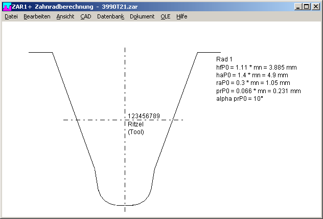 Neu unter Ansicht->Bezugsprofil ist eine zeichnerische Darstellung des Bezugsprofils mit Angabe der Höhenfaktoren und Radien sowie, falls vorhanden, Protuberanz und Kopfkantenbruch.