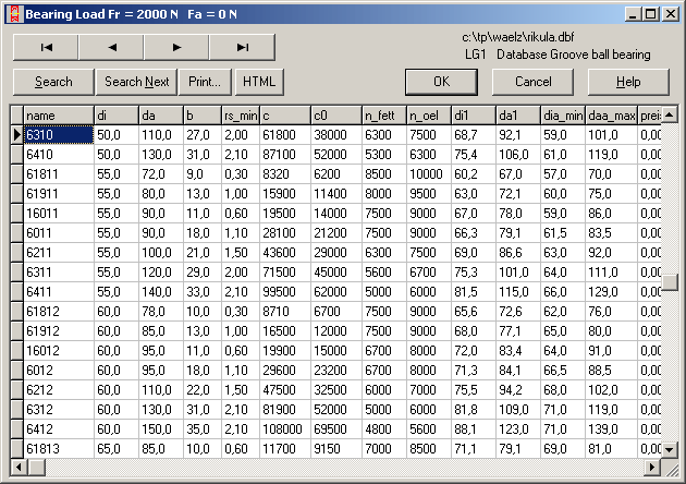 LG1 loads all dimensions and bearing data from the integrated data base so that you only have to choose the required bearing. The package includes data on 600 grooved ball bearings, 100 self-aligning ball bearings, 65 needle bushes, 170 needle bearings, 500 cylinder roller bearings, 300 taper roller bearings, 360 self-aligning roller bearings, 60 angular contact ball bearings, 50 two-row angular contact ball bearings, 230 needle roller cage. Dimensions, support data, permissable speed are provided by the SKF and INA (needle bushes) companies. The data base files use the common DBF (xBase) format and can be modified and appended as required. An info field is provided for your own input.