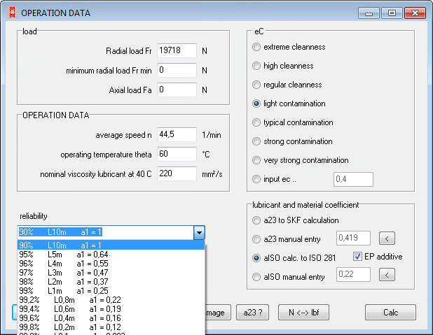 The LG1 software calculates the bearing lifetime for grooved ball bearings, self-aligning ball bearings, needle bushes, cylinder roller bearings, taper roller bearings and self-aligning roll bearings according to DIN. Modified lifetime according to specifications of the roller bearing manufacturers can also be calculated when you input the data for lubricant viscosity, bearing temperature and life expectancy. For an accurate calculation which takes lubricant gap cleanliness into account you can either enter your own data for the lubricant and material factor a23 or a ISO (according to DIN ISO 281), or have LG1 calculate it for you. You can enter the middle radial and/or axial force directly, or have them calculated by LG1 from the load collective, static and alternating force components or constantly increasing force.