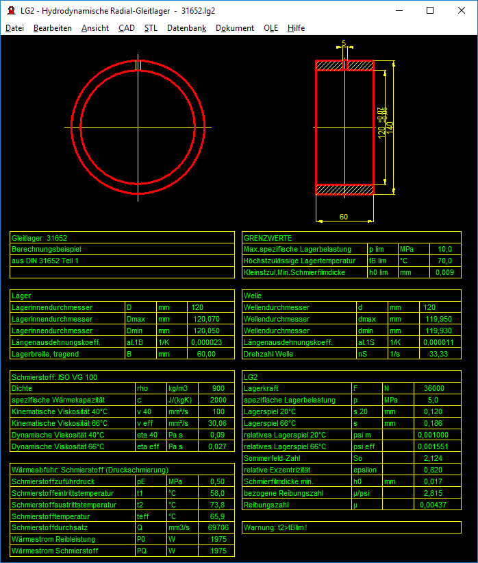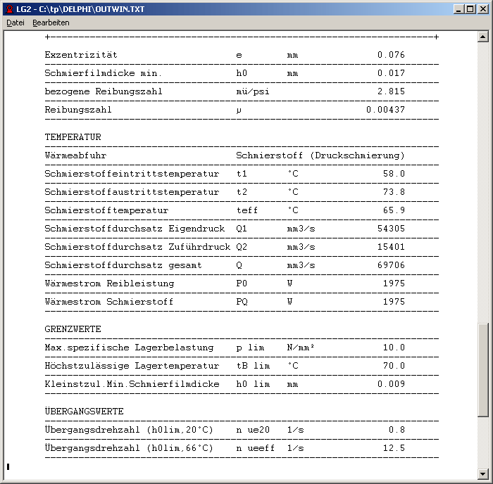 LG2 berechnet hydrodynamische Radial-Gleitlager mit 360° Umschließungswinkel im stationären Betrieb nach DIN 31652. Das Programm berechnet sowohl drucklos geschmierte Lager mit Wärmeabfluß durch Konvektion, als auch Gleitlager mit Druckschmierung bei Wärmeabfuhr durch das Schmiermittel. Lagertemperatur bzw. Schmierstoffaustrittstemperatur ermittelt LG2 iterativ gemäß DIN 31652 Teil 1. Das Programm berechnet die Viskosität von Schmierölen ISO VG nach DIN 51563. Sommerfeldzahl, Reibungszahl, Exzentrizität, Schmierstoffdurchsatz, Schmierfilmdicke und Verlagerungswinkel werden nach DIN 31652 Teil 2 berechnet. Grenzwerte für kleinstzulässige minimale Schmierfilmdicke, zulässige Flächenpressung und Lagertemperatur werden nach DIN 31652 Teil 3 ermittelt. Für das empfohlene Lagerspiel nach DIN 31652 kann Größt- und Kleinstmaß des Wellendurchmessers von LG2 berechnen lassen.