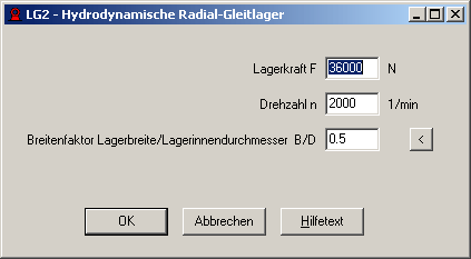 Aus Lagerkraft und Wellendrehzahl können Sie in der Vorauslegung von LG2 eine geeignete Gleitlagerung berechnen lassen. LG2 ermittelt die Abmessungen von Gleitlager und Welle, Lagerspiel und Abmaße. Wenn Eigenschmierung nicht ausreicht, wird Druckschmierung gewählt. Das Schmiermittel wird so gewählt, daß die Anforderungen an Schmierfilmdicke und Reibung erfüllt sind.