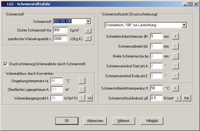 Als Schmiermittel kann ein Schmieröl ISO VG 2 bis ISO VG 1500 gewählt werden. Bei Druckschmierung sind Form, Lage und Abmessungen von Schmierloch, Schmiernut oder Schmiertasche einzugeben, außerdem Schmierstoffzuführdruck und Eintrittstemperatur. Bei Wärmeabfuhr durch Konvektion werden Umgebungstemperatur, Oberfläche und Wärmeübergangszahl benötigt.