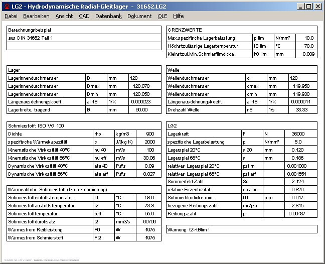 Die Richtwerte für Lagerspiel und zulässige minimale Schmierfilmdicke werden als Datenbankdatei mitgeliefert, ebenso die Abmessungen von Gleitlagern nach DIN 1850, Form G.