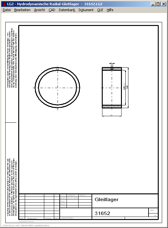 Eine Zeichnung der bemaßten Gleitlagerbuchse mit Zeichnungsrahmen kann ausgedruckt oder per DXF-/IGES-Schnittstelle in CAD übernommen werden. Zeichnungsinformationen und Änderungsindex werden direkt im Programm eingegeben.