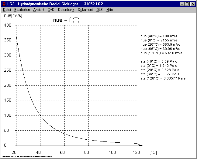 Dynamische und kinematische Viskosität des gewählten Schmierstoffs als Funktion der Temperatur kann man als Diagramm ausgeben.