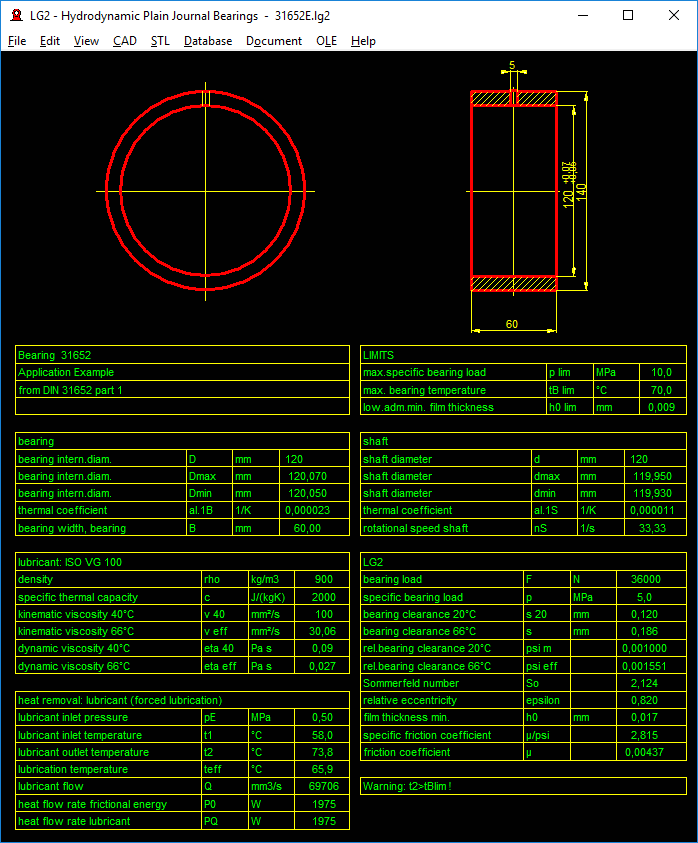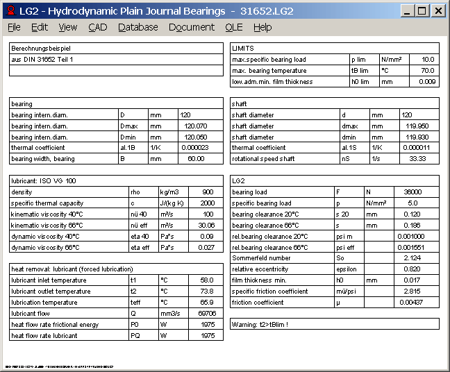 Bearing temperature or lubricant outlet temperature are calculated iterative according to DIN 31652 part 1. LG2 calculates temperature-dependent viscosity of ISO VG lubricants to DIN 51563. Sommerfeld number, friction coefficients, eccentricity, lubricant flow and film thickness are calculated according to DIN 31652 part 2. LG2 suggests limit values for allowable minimum film thickness, surface pressure and bearing temperature according to DIN 31652 part 3.