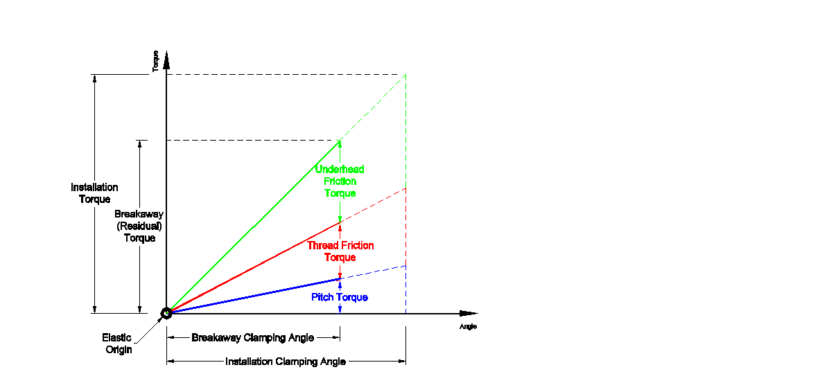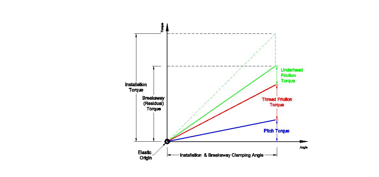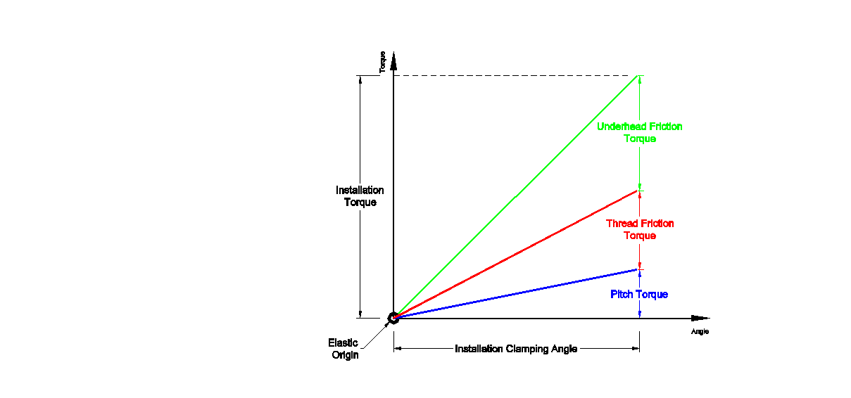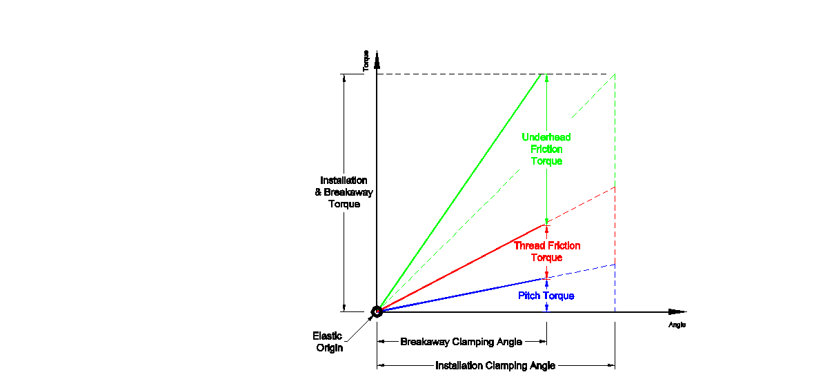 The torque applied to a fastener must overcome the friction in both the underhead region and in the threads to produce tension in the joint. The torque is broken down into three parts: underhead friction torque, thread friction torque, and pitch torque (the torque used to produce tension). Figure 1 shows the elastic region of a torque-angle signature projected back to the elastic origin and breaks out the torque values.