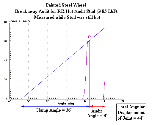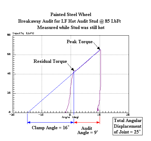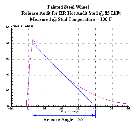 Recording torque-angle plots during a torque audit reveals a definite distinction between aluminum and painted steel wheels. The aluminum wheels tend to maintain their initial clamp force values better than the painted steel wheels after the testing and heat cycles. The aluminum wheels also tend to have a stronger resistance to slip (slipping between the washer and the wheel, clocking the stud back and forth).
