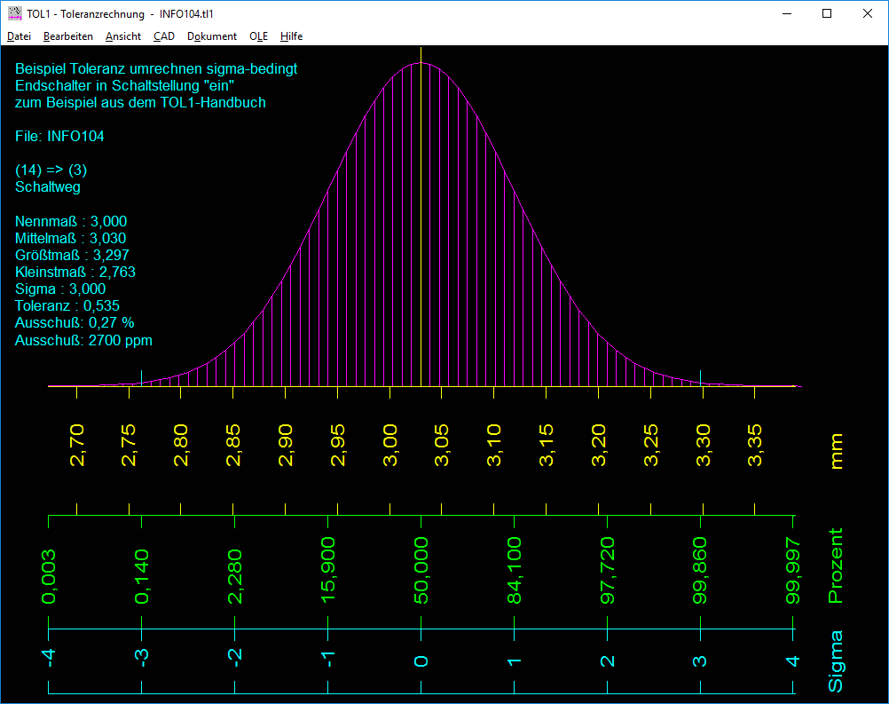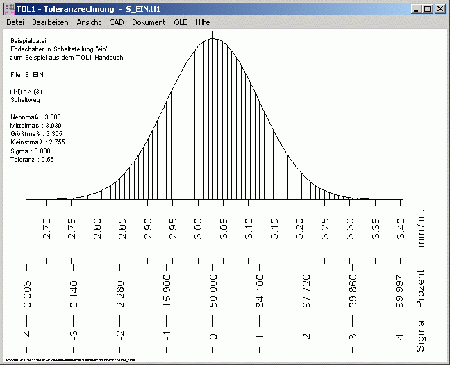 Die Maßkette aus den beteiligten Elementen können Sie als Grafik am Bildschirm darstellen lassen. Eine weitere Funktion zeigt die Verteilung unter der Gauß'schen Glockenkurve für den gewünschten Abstand.