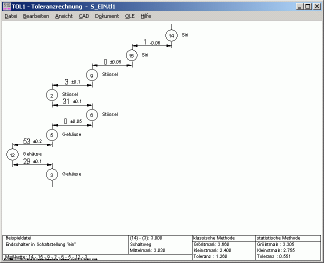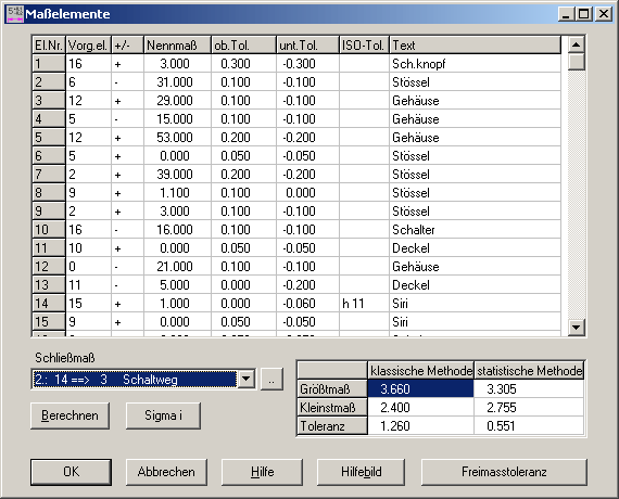 In einer Tabelle werden alle Maßebenen mit Vorgängerelement, Nennmaß, Toleranz und Richtung erfaßt. In einer zweiten Tabelle tragen Sie alle kritischen Abstände (Schließmaße) ein, deren Größt- und Kleinstmaß berechnet werden soll.