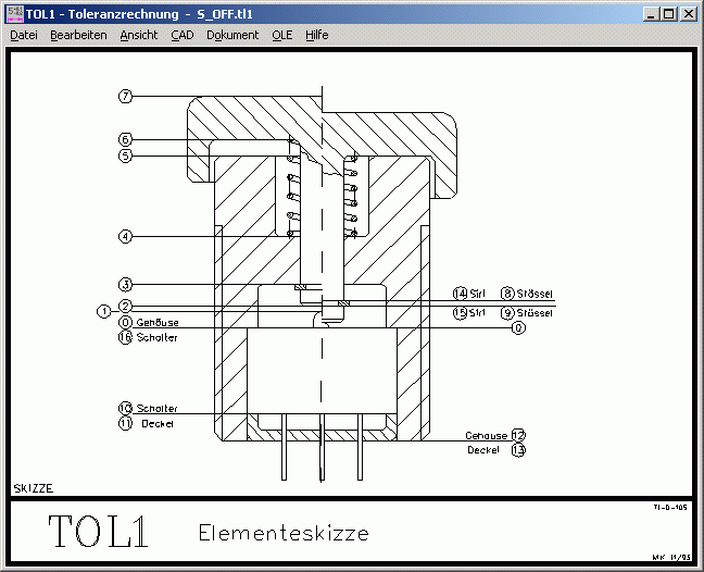 Für die systematische Erfassung Ihrer Konstruktion werden alle wichtigen Maßebenen durchnumeriert und Maße, Toleranzen und Abhängigkeiten in einer Tabelle erfaßt. TOL1 berechnet Ihnen dann Größt- und Kleinstmaß zwischen jedem beliebigen Abstand innerhalb der Maßkette.
